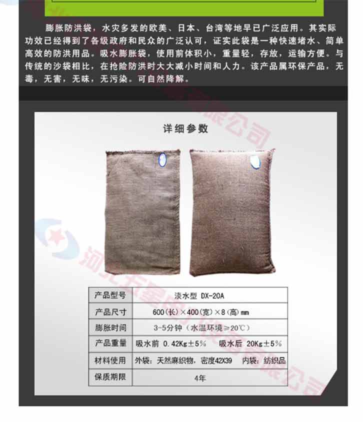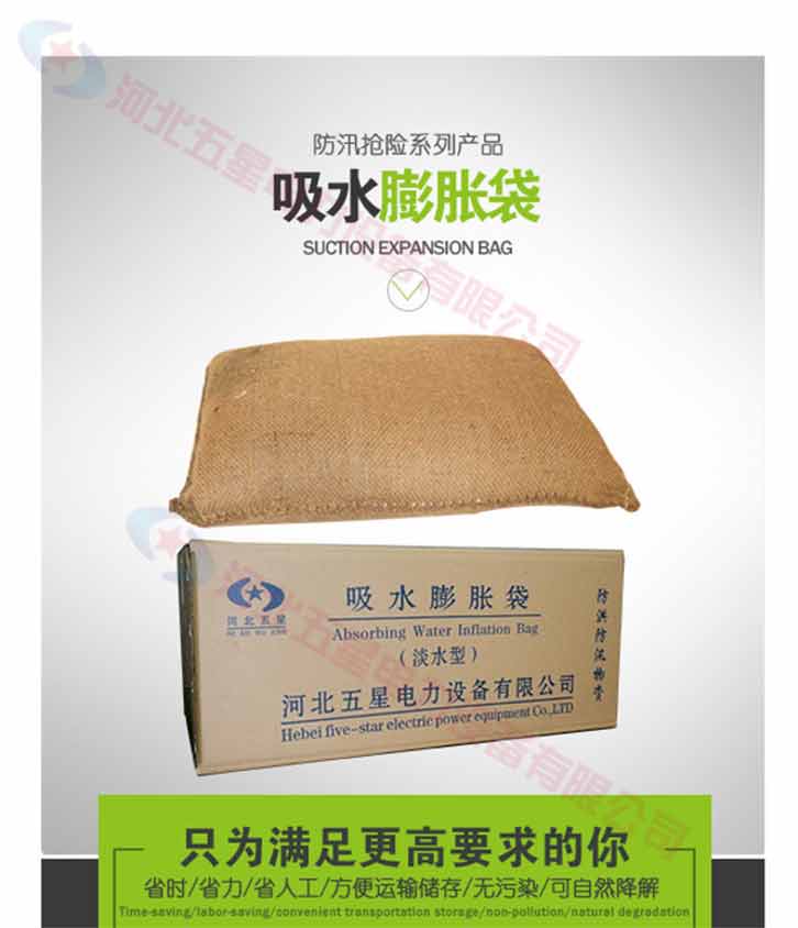 膨脹防洪袋,使用前體積小,重量輕,存放,運輸方便。與傳統(tǒng)的沙袋相比,在搶險防洪時大大減小時間和人力,另防洪搶險更有效率。吸水膨脹袋屬環(huán)保產(chǎn)品,無毒,無害,無味,無污染??勺匀唤到?。