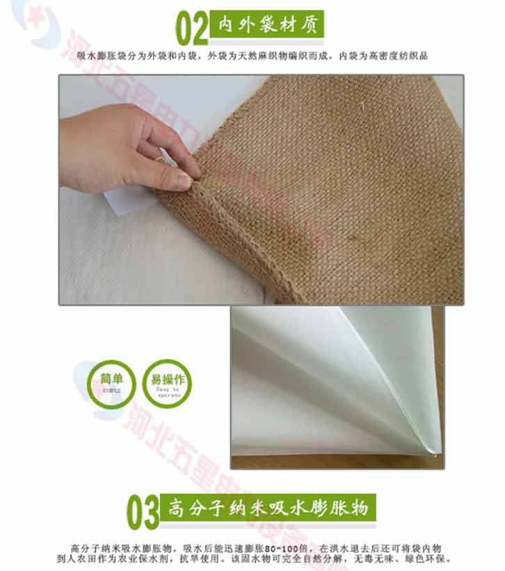 吸水膨脹袋內(nèi)裝的是新型的高分子納米吸水物質(zhì),這種物質(zhì)無毒、無味、無污染,吸水膨脹前為極小的顆粒物質(zhì),吸水后為黑豆大小的含水物質(zhì),干凈且無公害,待高分子吸水物質(zhì)使用后可用于農(nóng)業(yè)保水抗旱,所以在洪水過后可就地將袋內(nèi)的物質(zhì)傾倒入農(nóng)田中,在泥土中可完全分解,是綠色環(huán)保、一舉兩得的首選產(chǎn)品。外袋為純麻布和棉布織成,遇水后麻繩可更加結(jié)實耐磨。